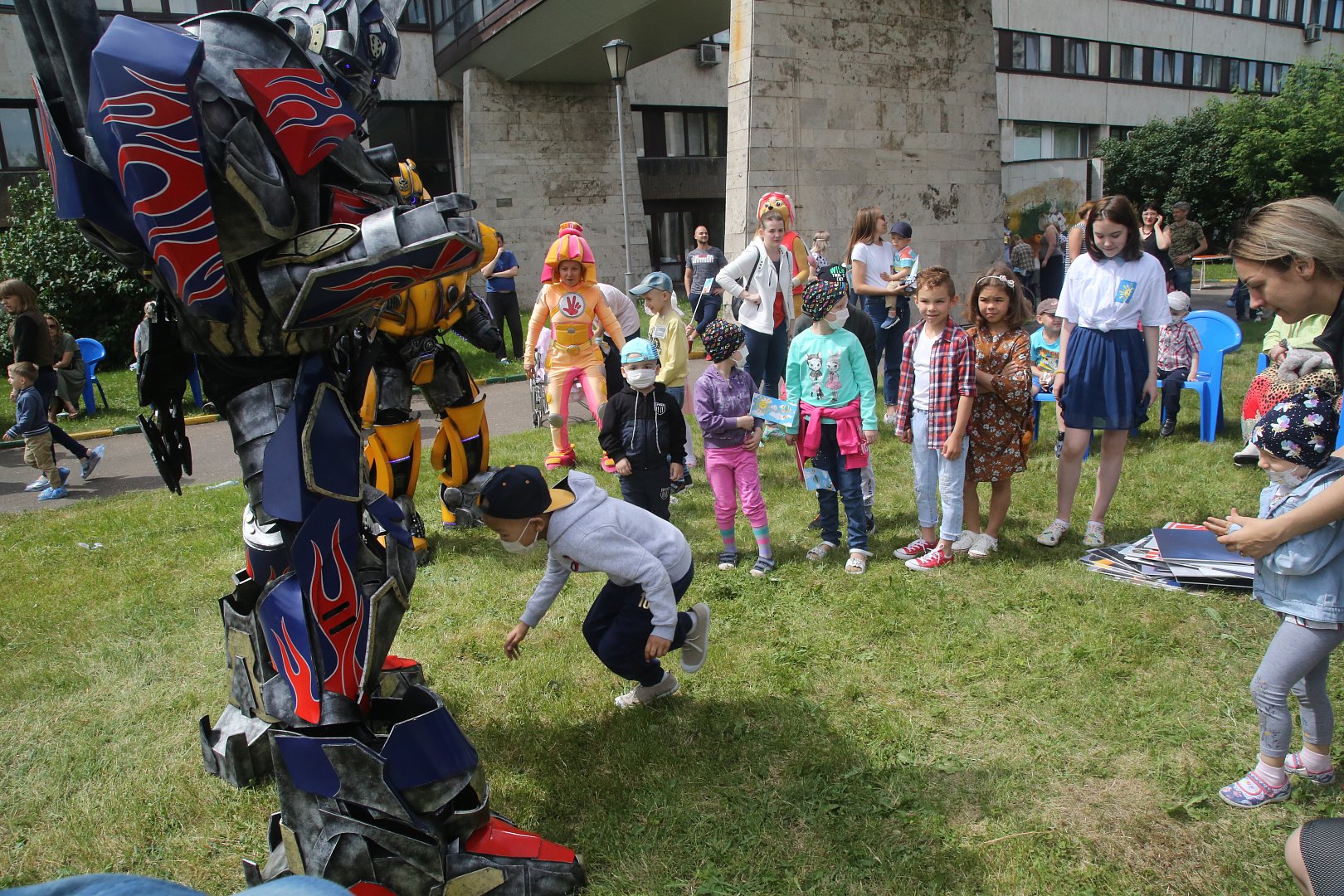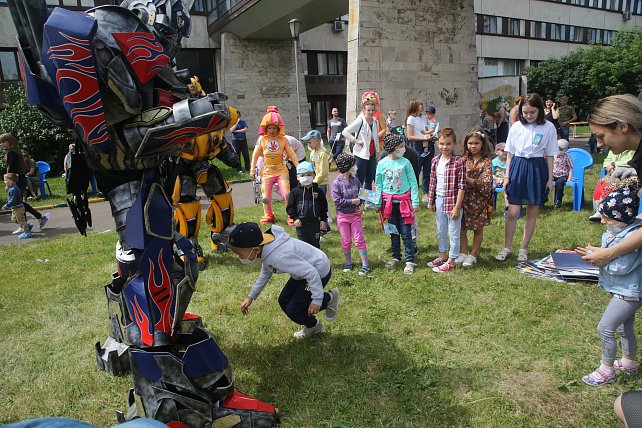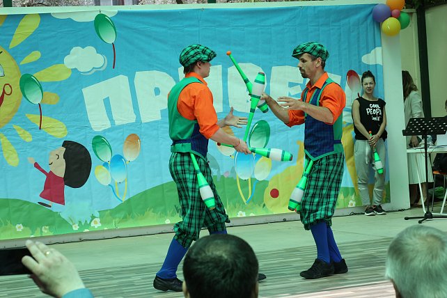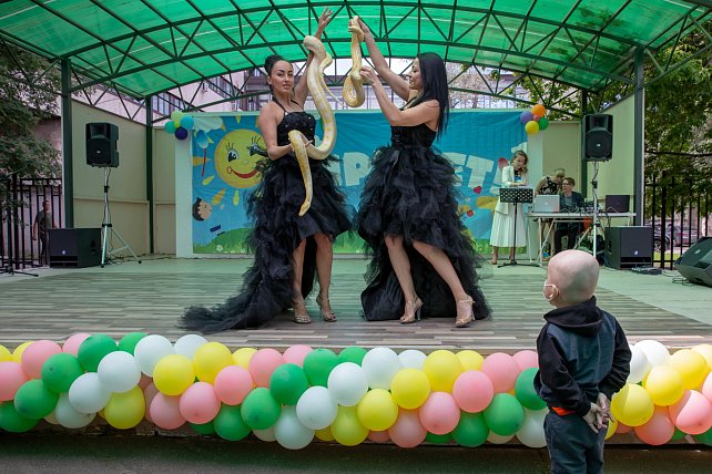 Праздник, посвящённый Дню защиты детей в НИИ детской онкологии и гематологии, по традиции, прошёл под открытым небом, во внутреннем дворике Онкоцентра, оборудованном сценой и игровыми площадками. Сегодня он был по-особенному ярко украшен.