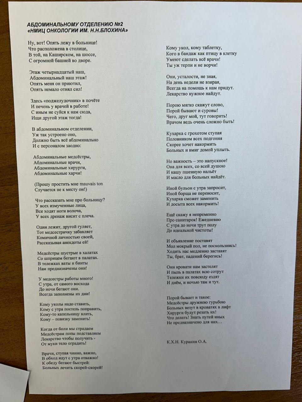 Уважаемый Николай Евгеньевич! От всего сердца хочу поблагодарить Вас и ваших помощниц: Викторию Юрьевну и Дарью Дмитриевну за то заботливое и душевное отношение к моей скромной персоне, когда я находился на лечении в абдоминальной отделении №2! А также весь персонал отделения, медсестер, санитарок и кухарок. Последние, возможно, не входят в штат отделения, но всё-равно, если есть возможность, передайте им слова благодарности!